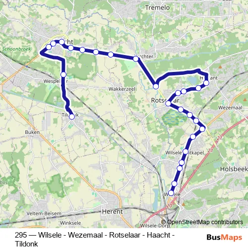 The first stop of the 295 bus route is Tildonk Sint-Angela and the last stop is Wilsele Gemeentehuis. 295 (Wilsele - Wezemaal - Rotselaar - Haacht - Tildonk) is operational during on weekdays.