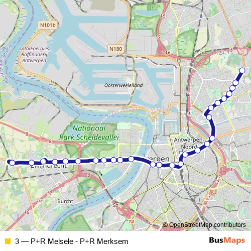 Tram 3 - P+R Melsele - P+R Merksem in Merksem: Stops & Timetable