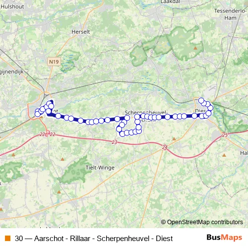 The first stop of the 30 bus route is Aarschot Station perron 9 and the last stop is Diest Station perron 1. 30 (Aarschot - Rillaar - Scherpenheuvel - Diest) is operational during everyday.