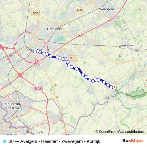 The first stop of the 30 bus route is Zwevegem Frankrijklaan and the last stop is Kortrijk Busterminal 3 perron 34. 30 (Avelgem - Heestert - Zwevegem - Kortrijk) is operational during everyday.