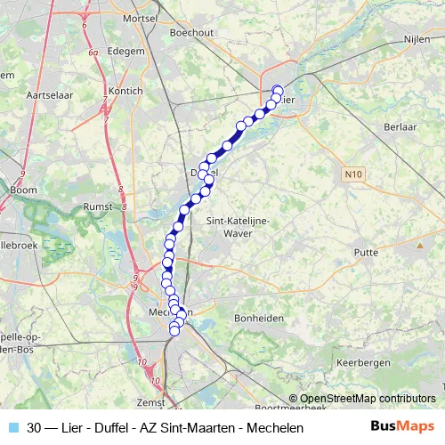 The first stop of the 30 bus route is Lier Station perron 7 and the last stop is Mechelen Station perron 16. 30 (Lier - Duffel - AZ Sint-Maarten - Mechelen) is operational during everyday.