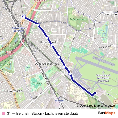 The first stop of the 31 bus route is Berchem Station perron 15 and the last stop is Deurne Luchthaven. 31 (Berchem Station - Luchthaven stelplaats) is operational during everyday.