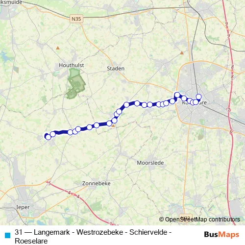 The first stop of the 31 bus route is Langemark Markt and the last stop is Roeselare Station perron 5. 31 (Langemark - Westrozebeke - Schiervelde - Roeselare) is operational during everyday.
