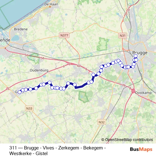 The first stop of the 311 bus route is Gistel Stadhuis and the last stop is Brugge Station perron C7. 311 (Brugge - Vives - Zerkegem - Bekegem - Westkerke - Gistel) is operational during on weekdays.