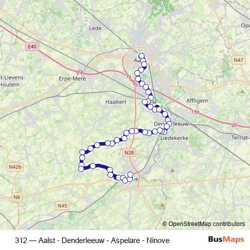 The first stop of the 312 bus route is Aalst Station perron 3 and the last stop is Ninove Station perron 3. 312 (Aalst - Denderleeuw - Aspelare - Ninove) is operational during on weekdays.
