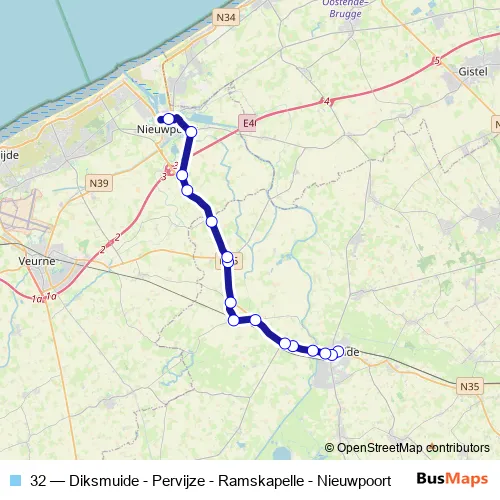 The first stop of the 32 bus route is Diksmuide Station perron 7 and the last stop is Nieuwpoort Stad. 32 (Diksmuide - Pervijze - Ramskapelle - Nieuwpoort) is operational during on weekdays.