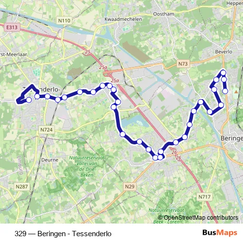 The first stop of the 329 bus route is Tessenderlo Campus Russelberg and the last stop is Koersel Beringen Mijnen. 329 (Beringen - Tessenderlo) is operational during on weekdays.