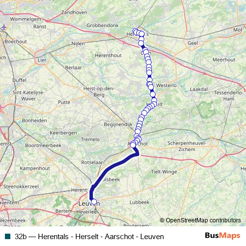 The first stop of the 32b bus route is Herentals Station perron 10 and the last stop is Leuven Station perron 1. 32b (Herentals - Herselt - Aarschot - Leuven) is operational during everyday.
