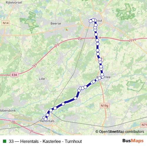 The first stop of the 33 bus route is Herentals Station perron 2 and the last stop is Turnhout Station perron 1. 33 (Herentals - Kasterlee - Turnhout) is operational during everyday.