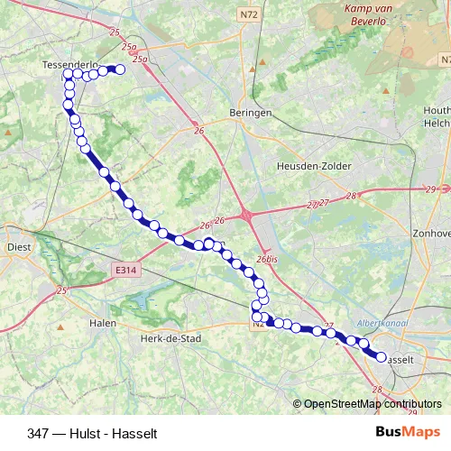 The first stop of the 347 bus route is Hasselt Station perron 13 and the last stop is Hulst Kerk. 347 (Hulst - Hasselt) is operational during on weekdays.