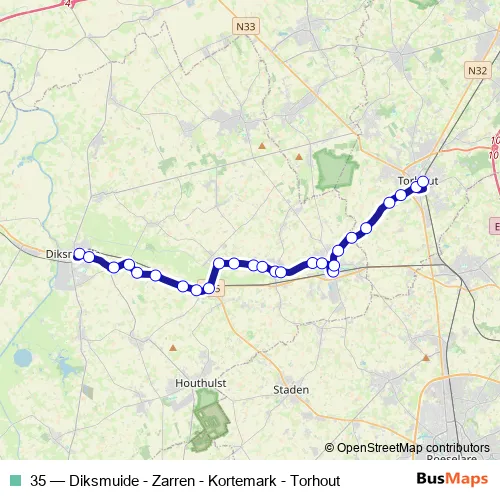 The first stop of the 35 bus route is Diksmuide Station perron 2 and the last stop is Torhout Station perron 4. 35 (Diksmuide - Zarren - Kortemark - Torhout) is operational during on weekdays.