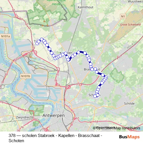 The first stop of the 378 bus route is Stabroek Pito and the last stop is Kapellen Dorp. 378 (scholen Stabroek - Kapellen - Brasschaat - Schoten) is operational during on weekdays.