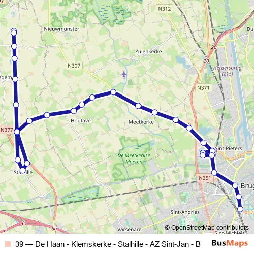 The first stop of the 39 bus route is De, Haan Zeepreventorium and the last stop is Brugge, Station perron C6. 39 (De Haan - Klemskerke - Stalhille - AZ Sint-Jan - B) is operational during everyday.
