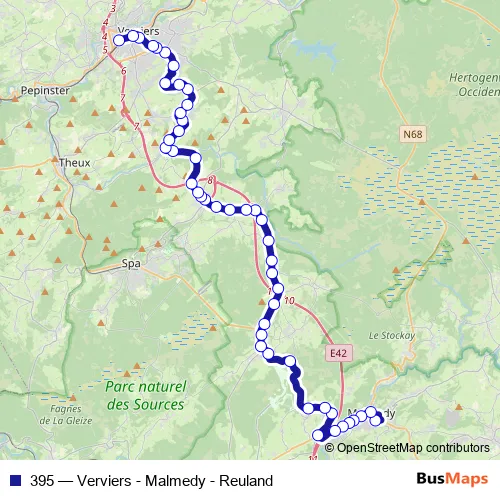 The first stop of the 395 bus route is Malmedy Gare and the last stop is Verviers Gare Centrale - Quai B. 395 (Verviers - Malmedy - Reuland) is operational during everyday.