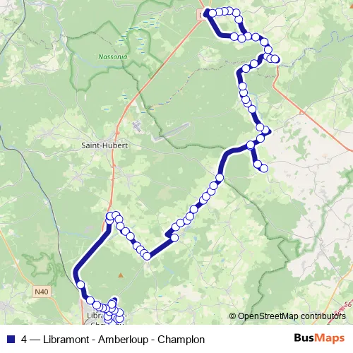 The first stop of the 4 bus route is Libramont Rue du Village and the last stop is Lavacherie Eglise. 4 (Libramont - Amberloup - Champlon) is operational during on weekdays.