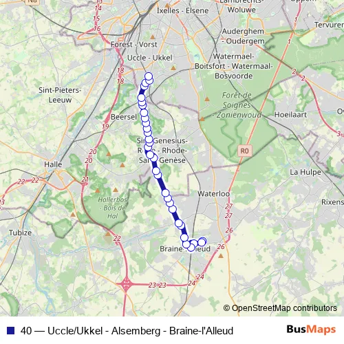 The first stop of the 40 bus route is Braine-L'Alleud Collège - Gare Ab and the last stop is Uccle Calevoet. 40 (Uccle/Ukkel - Alsemberg - Braine-l'Alleud) is operational during on weekdays.