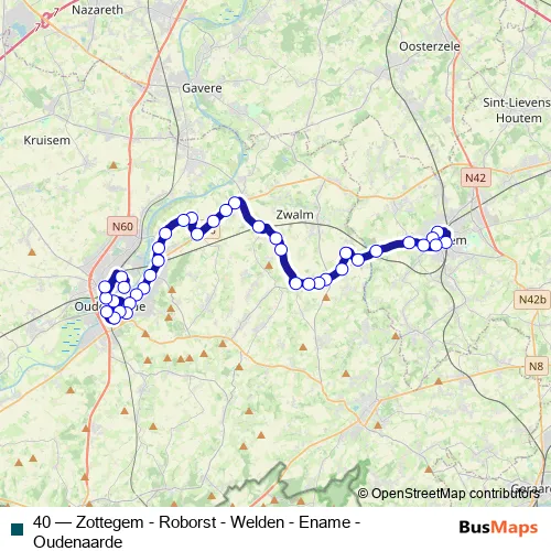The first stop of the 40 bus route is Zottegem Station perron 3 and the last stop is Oudenaarde Station perron 3. 40 (Zottegem - Roborst - Welden - Ename - Oudenaarde) is operational during everyday.