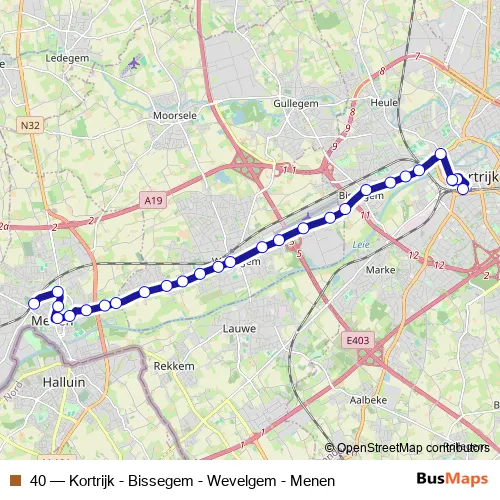 The first stop of the 40 bus route is Kortrijk Busterminal 6 perron 64 and the last stop is Menen Station perron 6. 40 (Kortrijk - Bissegem - Wevelgem - Menen) is operational during everyday.