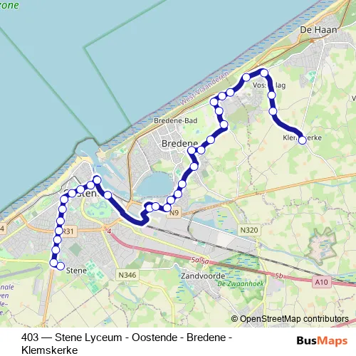 The first stop of the 403 bus route is Stene Lyceum and the last stop is Klemskerke Dorp. 403 (Stene Lyceum - Oostende - Bredene - Klemskerke) is operational during on weekdays.