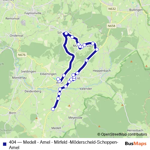 The first stop of the 404 bus route is Medell Im Koelchen and the last stop is Amel Gemeindeschule. 404 (Medell - Amel - Mirfeld -Möderscheid-Schoppen-Amel) is operational during on weekdays.