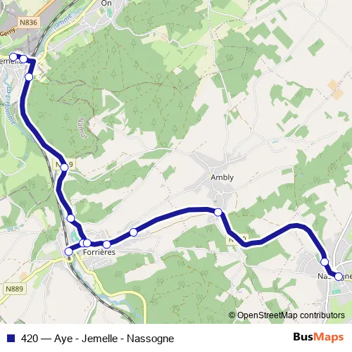 The first stop of the 420 bus route is Jemelle Place communale and the last stop is Nassogne Place Communale. 420 (Aye - Jemelle - Nassogne) is operational during everyday.