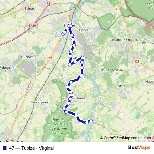 The first stop of the 47 bus route is Tubize Bloc Scolaire and the last stop is Fauquez Portique. 47 (Tubize - Virginal) is operational during everyday.