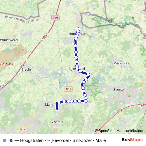 The first stop of the 48 bus route is Hoogstraten Van Aertselaerplein and the last stop is Oostmalle Maris Stella. 48 (Hoogstraten - Rijkevorsel - Sint-Jozef - Malle) is operational during everyday.