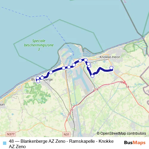 The first stop of the 48 bus route is Knokke AZ Zeno and the last stop is Blankenberge AZ Zeno. 48 (Blankenberge AZ Zeno - Ramskapelle - Knokke AZ Zeno) is operational during on weekdays.