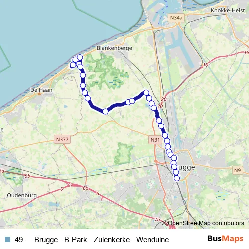 The first stop of the 49 bus route is Brugge Station perron C8 and the last stop is Wenduine Molen. 49 (Brugge - B-Park - Zuienkerke - Wenduine) is operational during everyday.