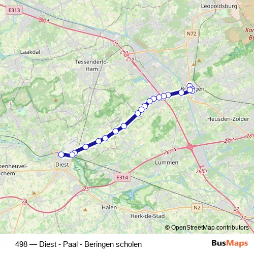 The first stop of the 498 bus route is Beringen Bogaersveld perron 4 and the last stop is Diest Station perron 4. 498 (Diest - Paal - Beringen scholen) is operational during on weekdays.