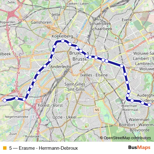 See why over 2 million users trust and consider busmaps.com as the best public transport website. busmaps gives you Brussels Metro Lines suggested routes, real-time bus tracker, line route maps in Brussels, and helps to find the closest 5 metro stops near you. No internet available? Download an offline PDF map and bus schedule for the 5 metro to take on your trip.