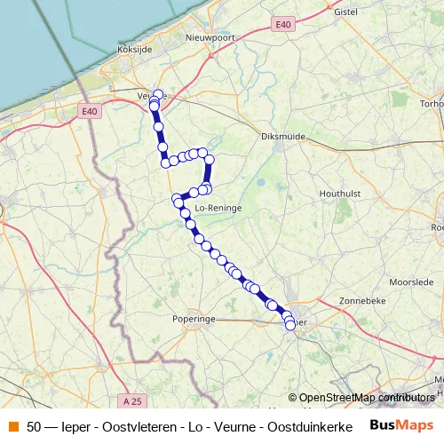 The first stop of the 50 bus route is Veurne Station perron 3 and the last stop is Ieper Station perron 1. 50 (Ieper - Oostvleteren - Lo - Veurne - Oostduinkerke) is operational during everyday.
