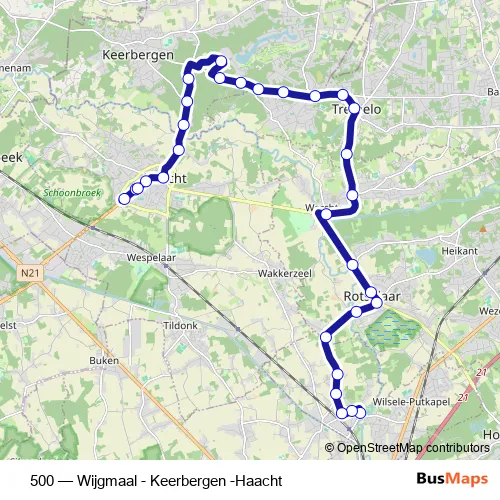 The first stop of the 500 bus route is Wijgmaal Sportcentrum and the last stop is Haacht Don Bosco. 500 (Wijgmaal - Keerbergen -Haacht) is operational during on weekdays.