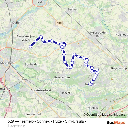 The first stop of the 529 bus route is Tremelo Vinneweg and the last stop is Sint-Katelijne-Waver Hagelstein. 529 (Tremelo - Schriek - Putte - Sint-Ursula - Hagelstein) is operational during on weekdays.