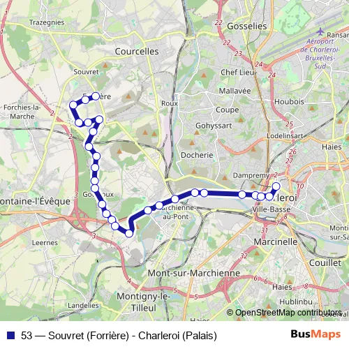 Bus 53 - Souvret (Forrière) - Charleroi (Palais) Schedule in Goutroux