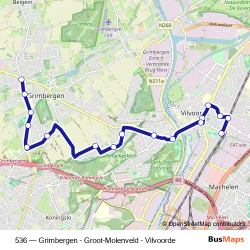 The first stop of the 536 bus route is Vilvoorde Station perron 5 and the last stop is Grimbergen Stelplaats perron 2. 536 (Grimbergen - Groot-Molenveld - Vilvoorde) is operational during on weekdays.