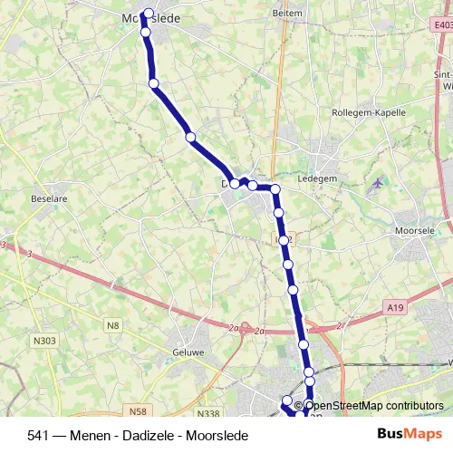 The first stop of the 541 bus route is Menen Station perron 5 and the last stop is Moorslede Centrum. 541 (Menen - Dadizele - Moorslede) is operational during on weekdays.