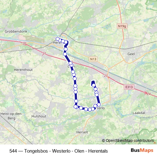 The first stop of the 544 bus route is Tongerlo Tongelsbos and the last stop is Herentals Station afstaphalte. 544 (Tongelsbos - Westerlo - Olen - Herentals) is operational during on weekdays.