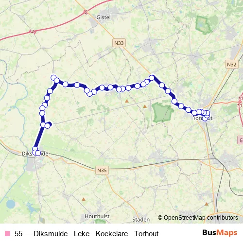 The first stop of the 55 bus route is Torhout Station perron 5 and the last stop is Diksmuide Station perron 3. 55 (Diksmuide - Leke - Koekelare - Torhout) is operational during everyday.