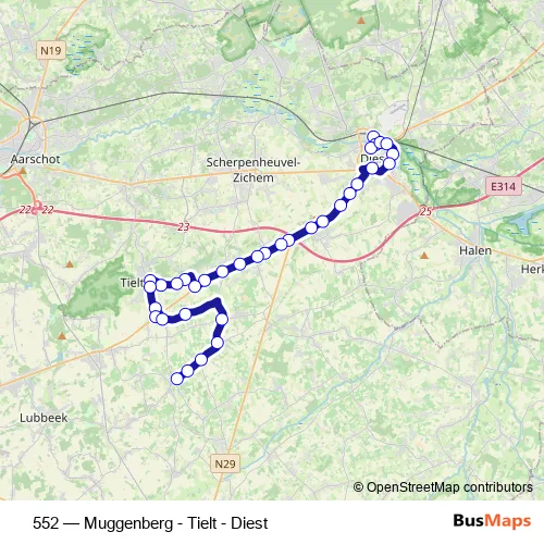 The first stop of the 552 bus route is Diest Station perron 4 and the last stop is Meensel-Kiezegem Tramstraat. 552 (Muggenberg - Tielt - Diest) is operational during on weekdays.