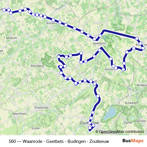 The first stop of the 560 bus route is Zoutleeuw Zusterschool and the last stop is Waanrode Kerk. 560 (Waanrode - Geetbets - Budingen - Zoutleeuw) is operational during on weekdays.