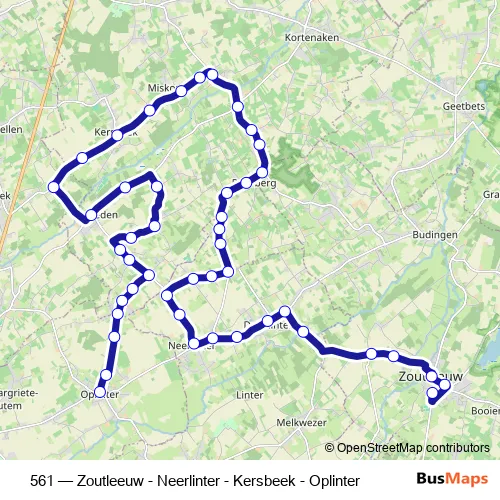 The first stop of the 561 bus route is Zoutleeuw Zusterschool and the last stop is Oplinter Sint-Genovevaplein. 561 (Zoutleeuw - Neerlinter - Kersbeek - Oplinter) is operational during on weekdays.