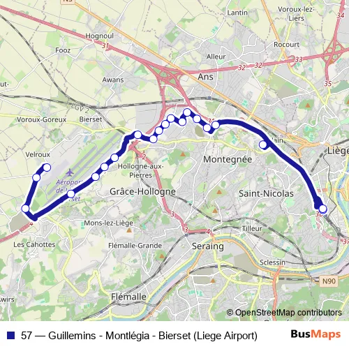 The first stop of the 57 bus route is Velroux Airside Nord and the last stop is Liege Gare des Guillemins - Quai F. 57 (Guillemins - Montlégia - Bierset (Liege Airport)) is operational during everyday.