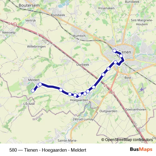 The first stop of the 580 bus route is Meldert Sint-Janscollege and the last stop is Tienen Station afstaphalte. 580 (Tienen - Hoegaarden - Meldert) is operational during on weekdays.