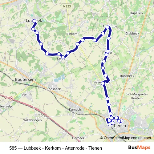 The first stop of the 585 bus route is Tienen Waaibergstraat and the last stop is Lubbeek Dorp. 585 (Lubbeek - Kerkom - Attenrode - Tienen) is operational during on weekdays.