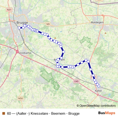 The first stop of the 60 bus route is Knesselare, Dorp and the last stop is Brugge, Station perron C6. 60 ((Aalter -) Knesselare - Beernem - Brugge) is operational during everyday.