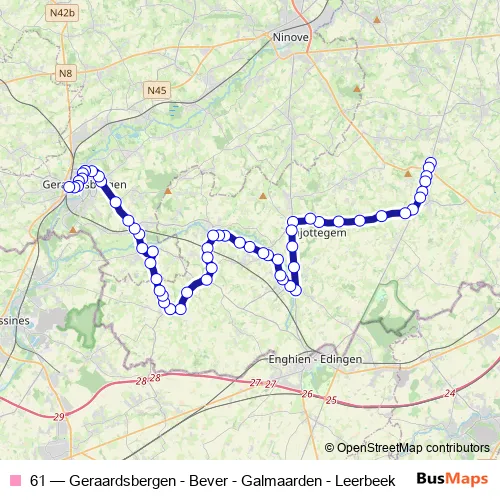 The first stop of the 61 bus route is Geraardsbergen Station perron 7 and the last stop is Leerbeek Stelplaats Perron B. 61 (Geraardsbergen - Bever - Galmaarden - Leerbeek) is operational during everyday.