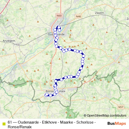 The first stop of the 61 bus route is Oudenaarde Sportcentrum and the last stop is Ronse Floréal. 61 (Oudenaarde - Etikhove - Maarke - Schorisse - Ronse/Renaix) is operational during everyday.