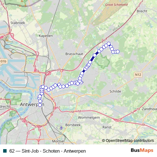 The first stop of the 62 bus route is Antwerpen, Roosevelt perron C1 and the last stop is Sint-Job-in-'t-Goor, Kristus Koning Kerklei. 62 (Sint-Job - Schoten - Antwerpen) is operational during everyday.