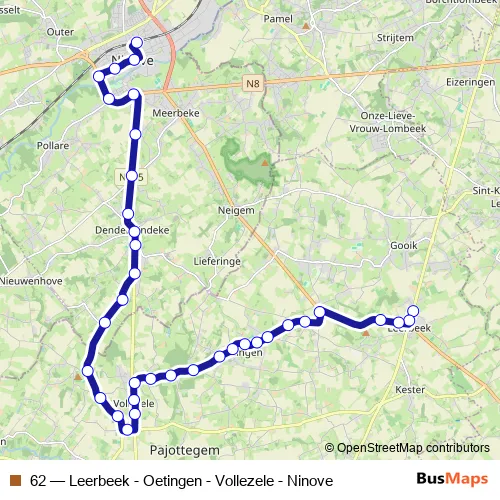 The first stop of the 62 bus route is Leerbeek Stelplaats Perron B and the last stop is Ninove Station perron 1. 62 (Leerbeek - Oetingen - Vollezele - Ninove) is operational during everyday.